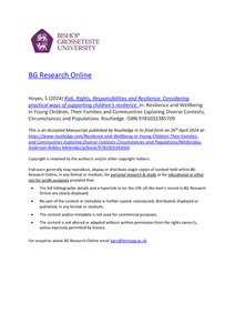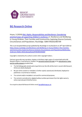 Hoyes, S. (2024) Risk, Rights, Responsibilities and Resilience: Considering practical ways of supporting children’s resilience. In: Resilience and Wellbeing in Young Children, Their Families and Communities Exploring Diverse Contexts, Circumstances and Populations. Routledge. ISBN 9781032385709 (In Press)