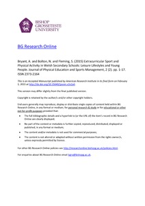 Bryant, A., Bolton, N. and Fleming, S. (2015) Extracurricular Sport and Physical Activity in Welsh Secondary Schools: Leisure Lifestyles and Young People. Journal of Physical Education and Sports Management, 2 (2). pp. 1-17. ISSN 2373-2164
